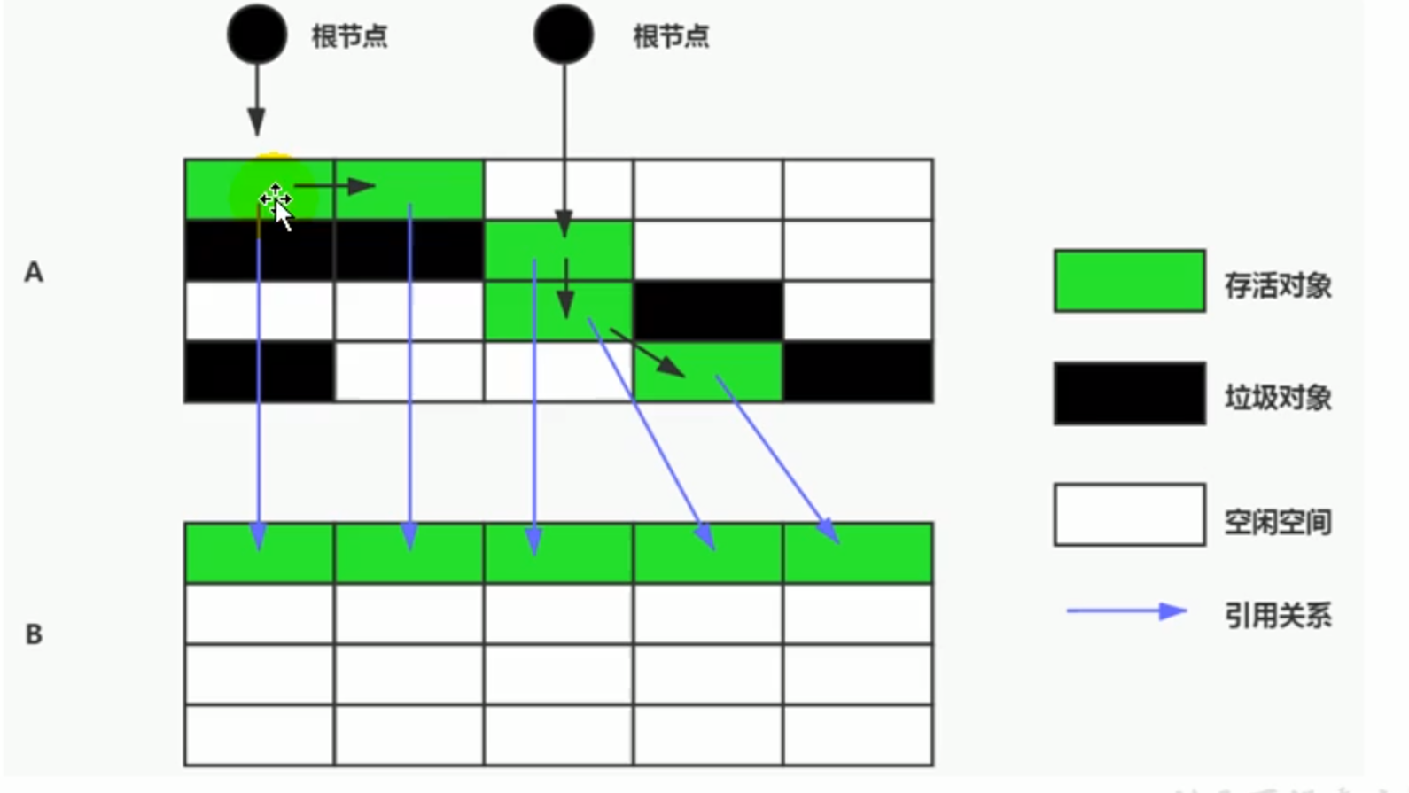 - 除了上述固定的GC Roots对象外,根据用户所选用的垃圾回收器以及当前回收的内存区域不同,还可以有其他对象“临时”加入。比如当回收新生代区域时,老年代中的对象也属于GC Roots,需要判断老年代中的引用是否指向了新生代中的对象。