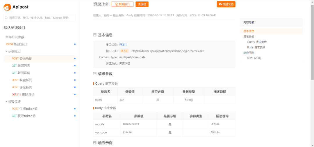 可以直观的看到,Apipost界面展示信息很全,左侧有菜单栏可以看到项目信息,中间是详细接口信息,包括项目/接口列表、基本接口信息(创建人、创建时间、更新时间,以及接口开发进度、状态、认证方式等)、参数、响应示例等;而且是纯中文界面,让人一看就很明白,想知道的信息都会展示在文档里。