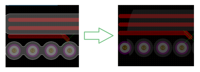- Off - 走线过程中不启用该平滑走线,但是在布线结束或拖拽的时候依然会进行清理,适用于已经布板结束的时候微调。