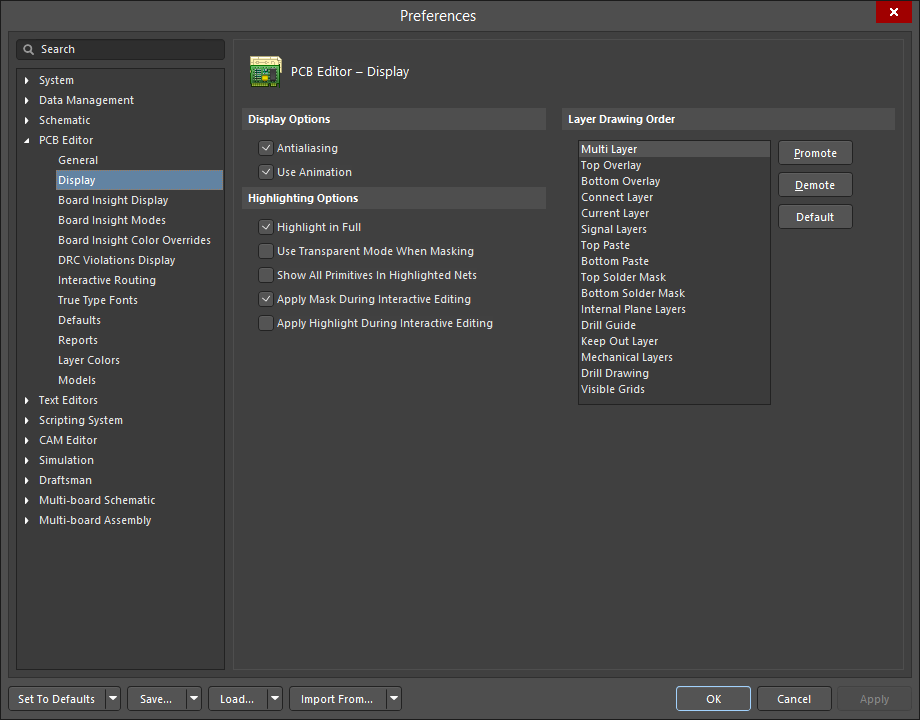 - Use Animation - 勾选此项在缩放、翻转PCB或开关层的时候启用动画效果。