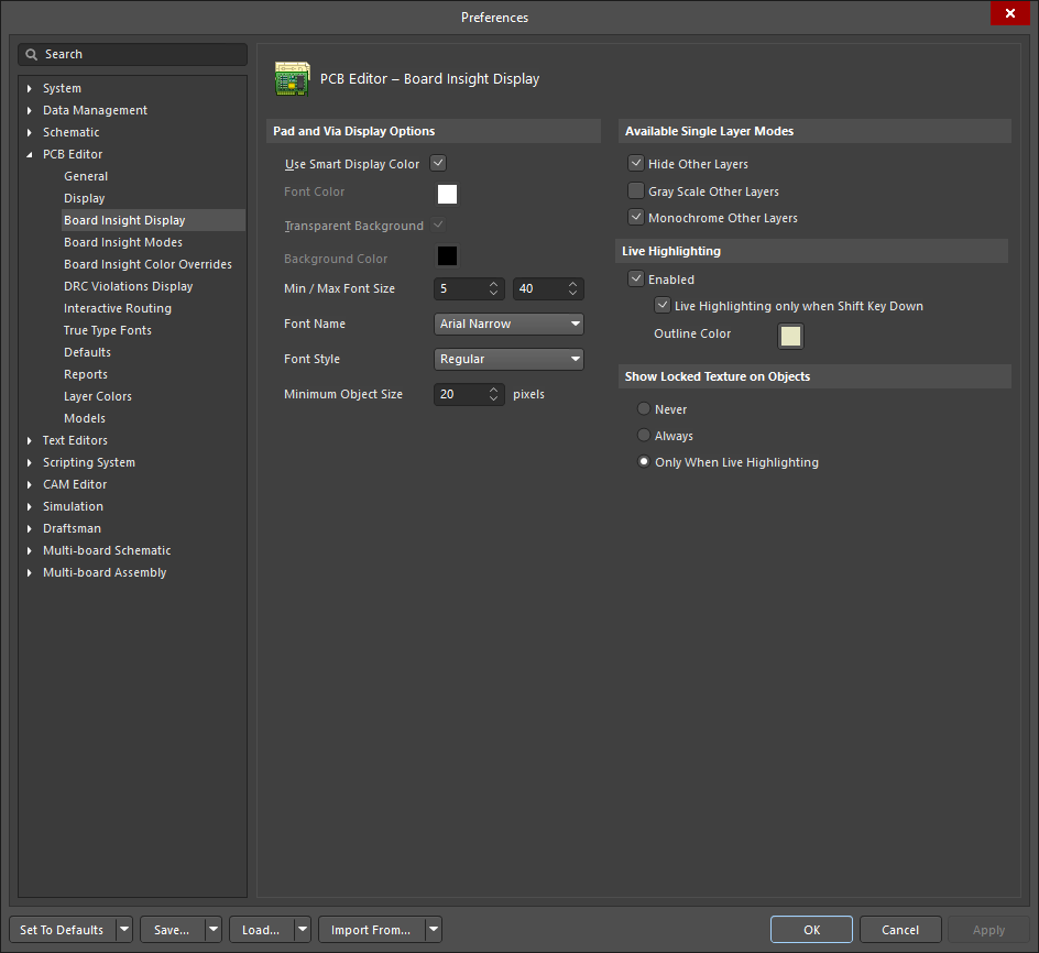 - Use Smart Display Color – 勾选此项,软件自动控制显示焊盘与过孔详情的字体特征,否则可以手动设置.