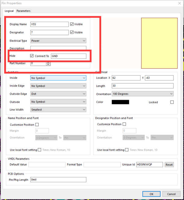 在AD17以及更早的版本中,如图有一个示例:我们隐藏第七个引脚,但是希望自动连接到GND,就可以这样操作了。