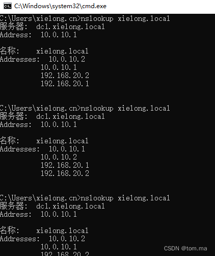(1)验证DNS轮循,由于我们深圳的IP是10.0.30.0/24,跟上海跟台北的IP不在一个C类网段里,所以会启用轮循