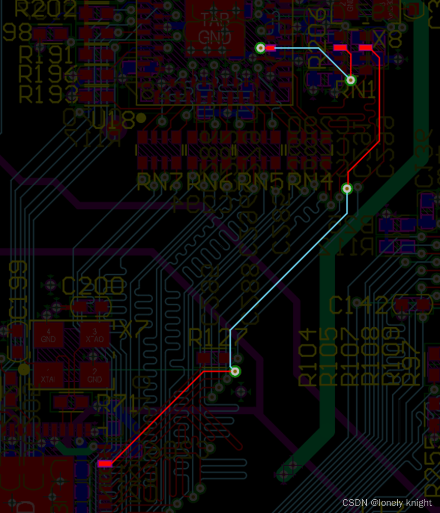 注意!特别注意!刚刚匹配好的端对端可能受网络名,分支等等一系列问题影响会出现线路错误问题如下,观察黄色线为系统匹配走线,蓝色线为正确走线,因此这步需要手动检查调整