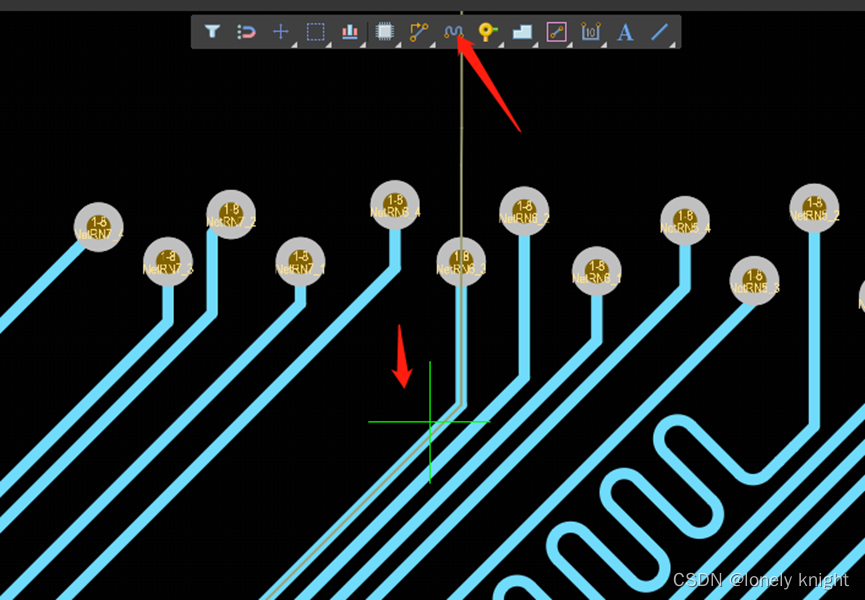 点击图标设置为等长走线模式,图标变成十字锁定状态