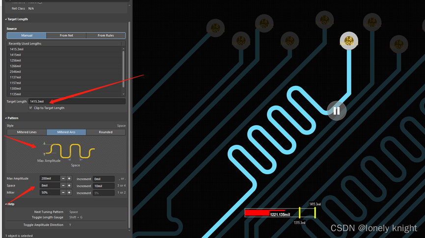 按TAB,设置目标长度和绕等长规则,这些根据布线规则定如:3W等