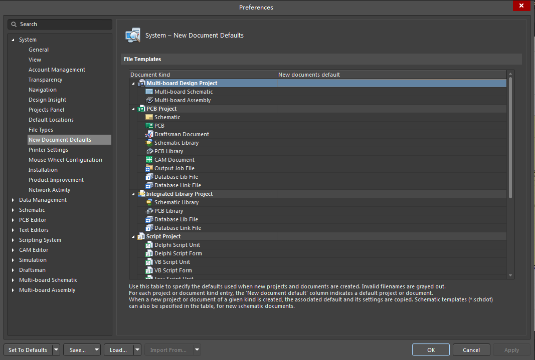 “首选项”对话框的“系统-新文档默认值”页面允许您指定创建新项目和文档时使用的默认值。您可以为所有类型的Altium Designer文档加载文件或服务器来源的模板。可以随意保存和加载首选项,重要的是,可以将这些首选项作为“托管首选项”发布到托管内容服务器,以供其他人重用。