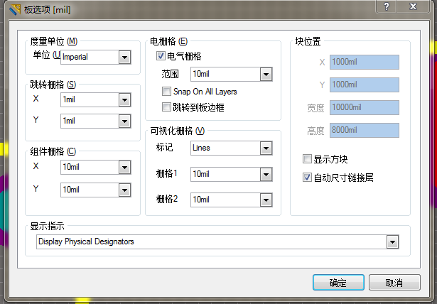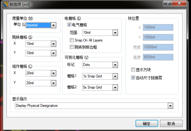 3、可视化栅格(Visible Grid):可视化栅格式独立的跳转栅格。就是背景图中一格的距离,在PCB编辑界面中有两种可视化栅格,再电路板选项对话框中设置并单独显示。