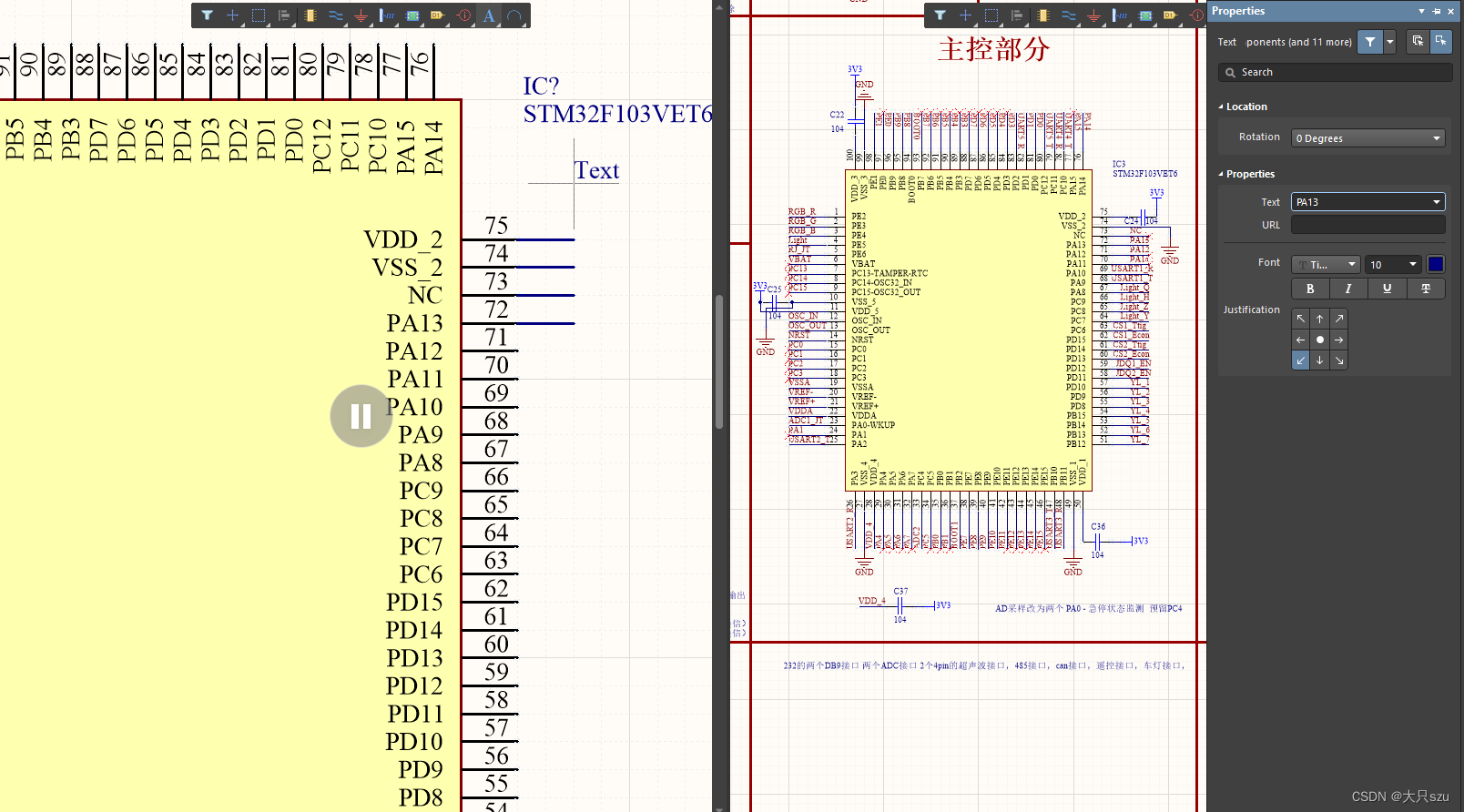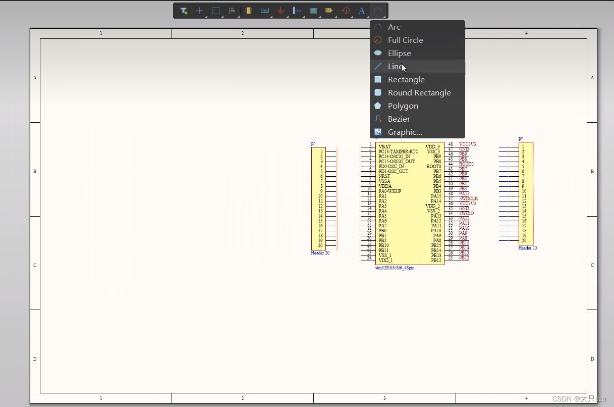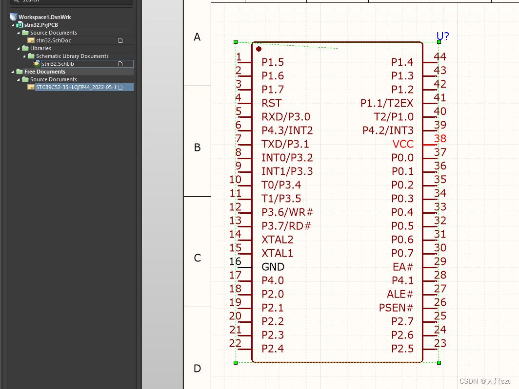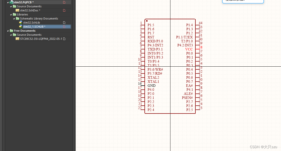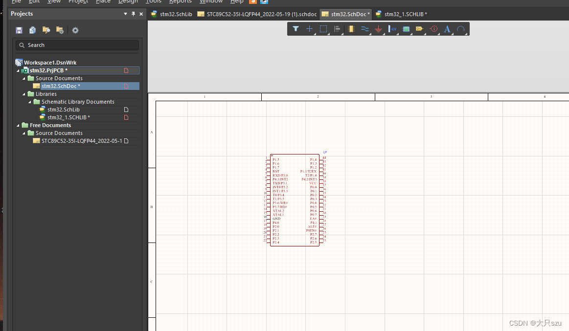 此时无法从导入的文件中简单复制原理图到stm32.SchLib中,那么我们先把原理图复制stm32.SchDoc中