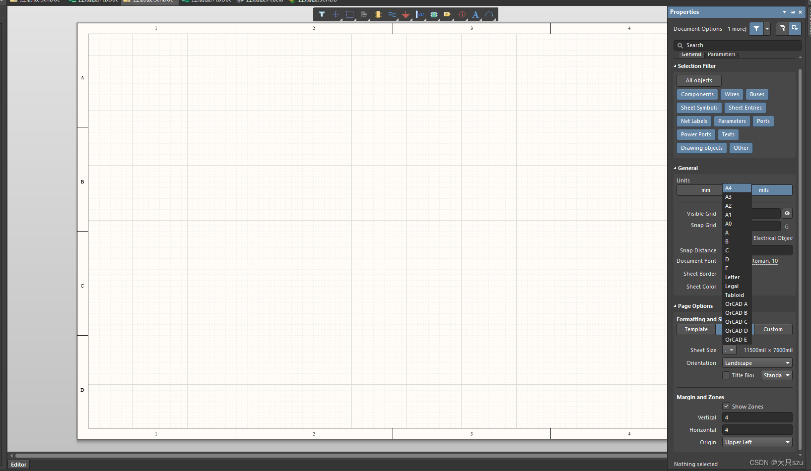 打开Properties就能设置原理图的大小,和去掉右下角的Title Block