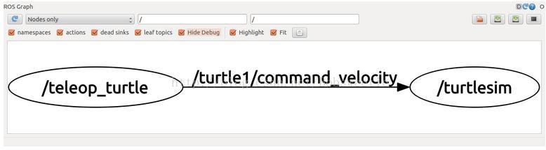 如果把鼠标放上去将会高亮,node是蓝色或者绿色,topic是红色.正如你所见到的一样,turtlesim_node and the turtle_teleop_key nodes 是通过叫做