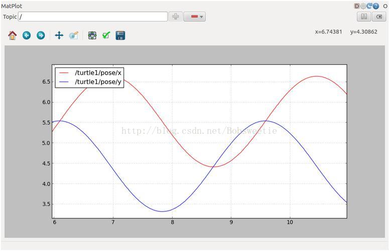 这时会弹出一个新的窗口,一个文本框出现再左上角,文本框是输入topicd的,这里我们输入/turtle1/pose/x会高亮原来不亮的按钮。按下它并且用/turtle1/pose/y重复同样的操作,就会看到x-y位置的图像出现。