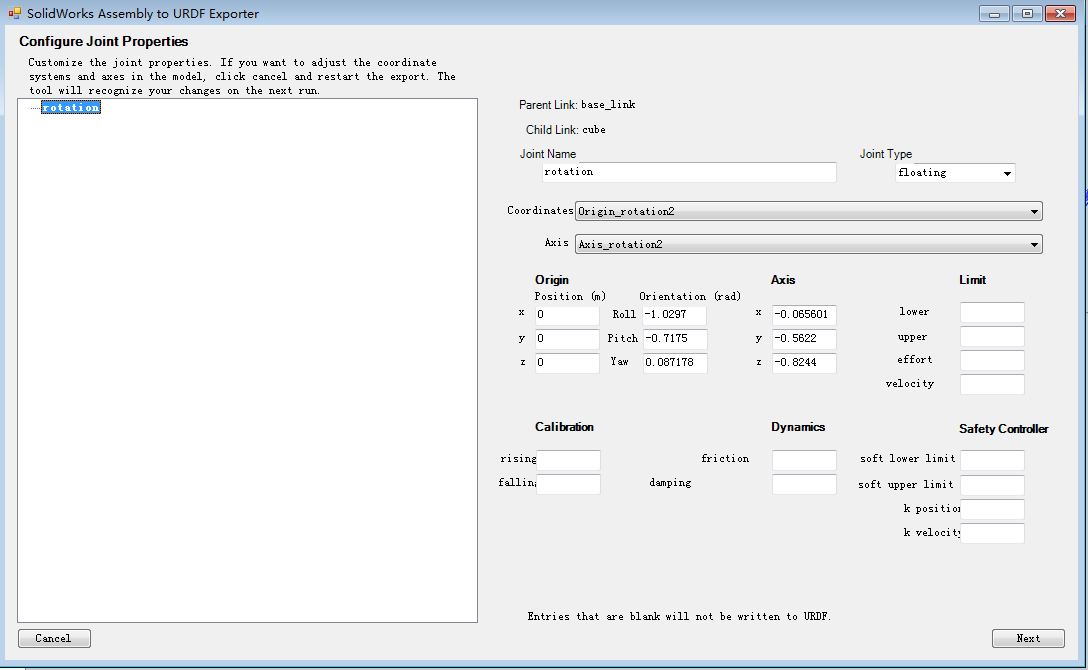 在装配体中的Export to urdf中选择preview, 会有如下窗口。