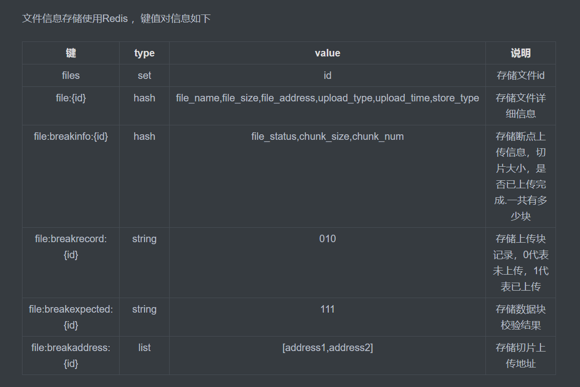 文件信息存储使用Redis ,键值对信息如下