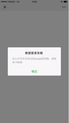 | 1 | ![]() | 此公众号并没有这些scope的权限,错误码:10005 | 1、建议检查一下公众号的功能。比如是不是在订阅号/未认证的公众号里面尝试调用认证服务号的功能。 |