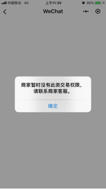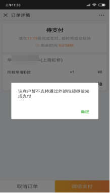 | 5 | ![]() | 该商户暂不支持通过外部拉起微信完成支付 | Jsapi支付只能从微信浏览器内发起支付请求 |