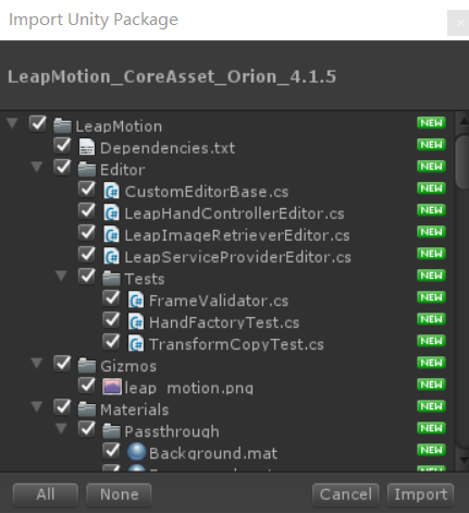 然后我们可以把下载好的Leap 支持的Untiy插件导入Unity中,如图所示,