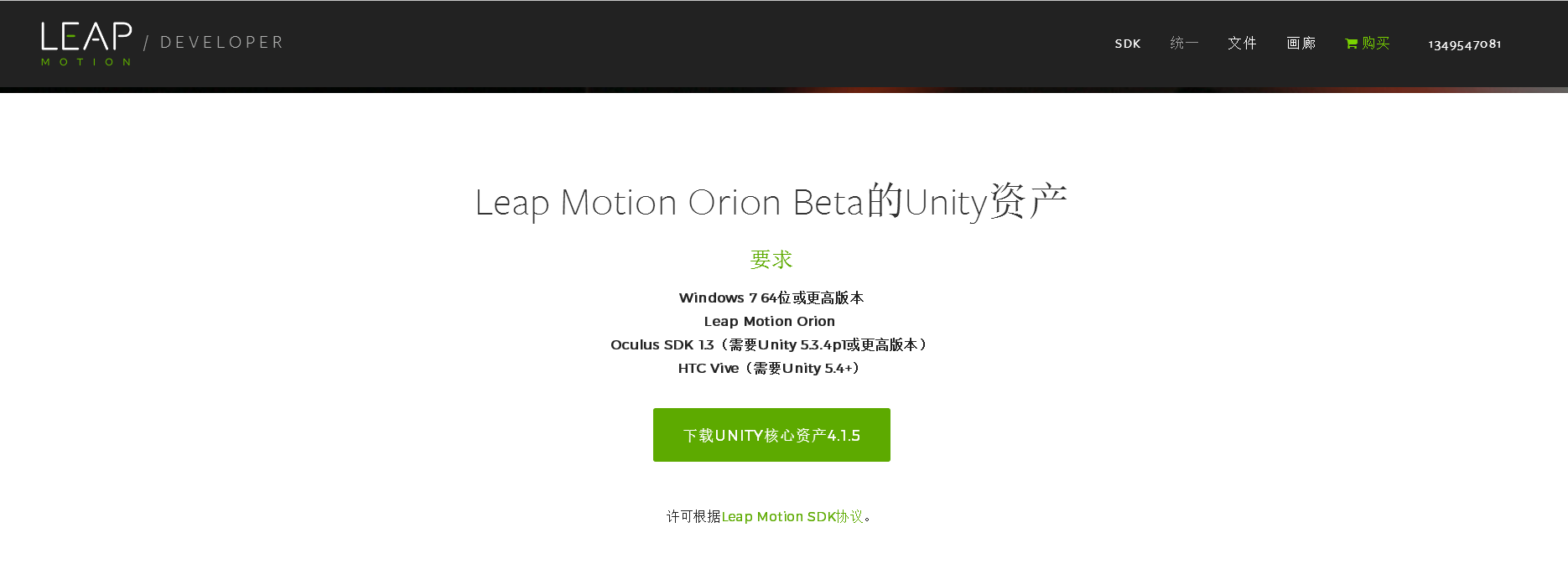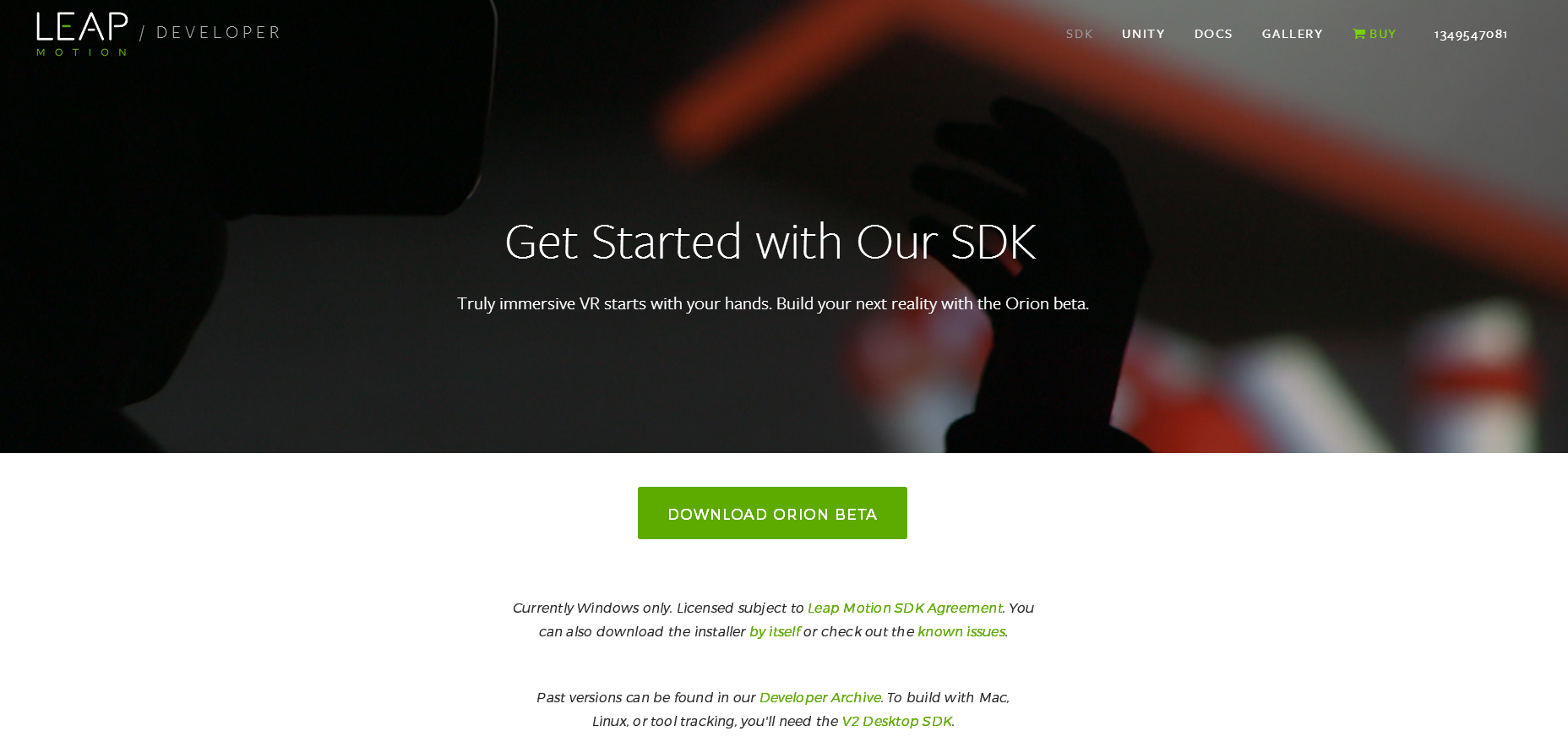 首先我们登陆Leap的官网,可以发现现在Leap发布了两套SDK,一套是正常在桌面上使用的,另一套就是在VR项目中使用的Orion BETA版本。下载这个最新的Orion BETA版本的SDK,下载地址:https://developer.leapmotion.com/get-stVRted。