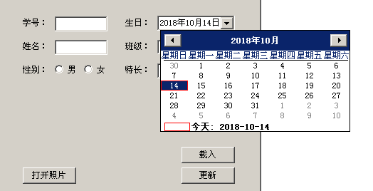 DataGridView控件、DateTimePicker控件、PhotoBox控件、textbox控件,如下例子: