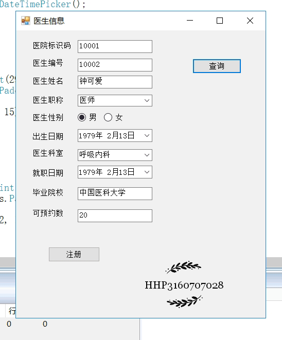当输入医生编号以及医院标识码时,点击查询将查询到医生的具体信息