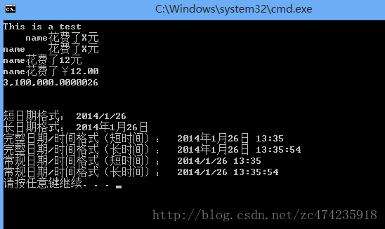 Console.WriteLine("{0}花费了{1}元", "name",12);