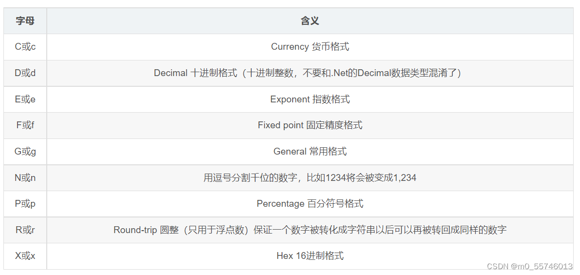 Console.WriteLine("{0:F5}", i); // 输出 123456.00000,为小数后的精度为5的格式
