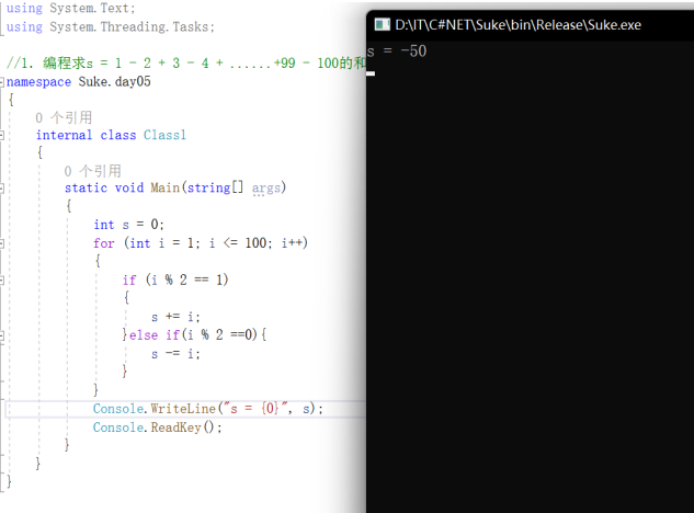//1.编程求s = 1 - 2 + 3 - 4 + ......+99 - 100的和。