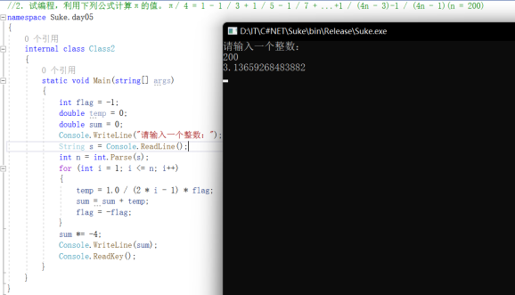 //2.试编程,利用下列公式计算π的值。π/ 4 = 1 - 1 / 3 + 1 / 5 - 1 / 7 + ...+1 / (4n - 3)-1 / (4n - 1)(n = 200)
