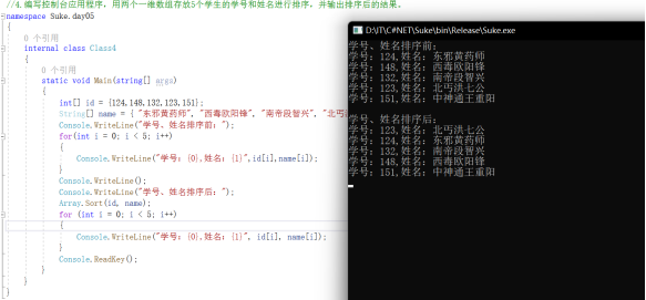 //4.编写控制台应用程序,用两个一维数组存放5个学生的学号和姓名进行排序,并输出排序后的结果。
