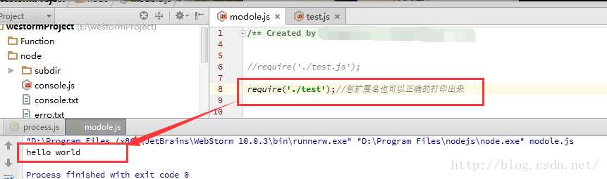 在下图中用reguire来引用test.js这个文件执行结果。