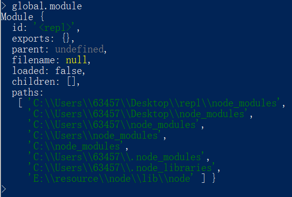 我们可以看到module是一个模块对象,其中有它的路径paths,children代表它加载的模块,所以这里也能推断出module不是全挂在global下,是根据父-子一层一层,最顶层就是global.module:
