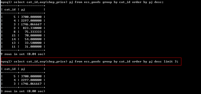select cat_id,avg(shop_price) as pj from ecs_goods group by cat_id order by pj desc limit 3;