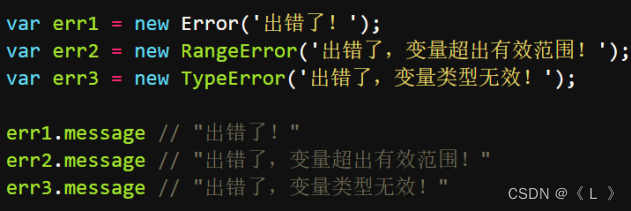 (1)Error实例对象是一般的错误类型,在他的基础上,JavaScript还定义了其他6中错误对象。也就是说,存在Error的6个派生对象