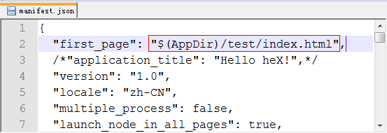 3、修改manifest.json文件,入口改为test/index.html,如下图所示