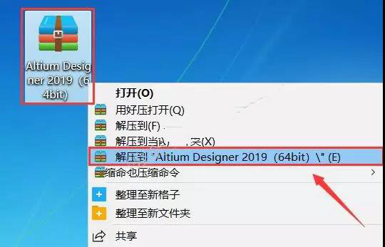 1.鼠标右击软件安装包,选择【解压到Altium Designer 2019(64bit)(E)】。