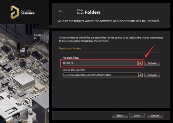 8.点击文件夹小图标,更改软件安装路径:建议安装在除C盘以外的其他磁盘,可选择在D盘或者其他盘里面新建一个AD19文件夹。