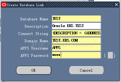 1.3 Connect String:输入连接字符串。如:(DESCRIPTION = (ADDRESS = (PROTOCOL = TCP)(HOST = test.ebs.com)(PORT = 1523))(CONNECT_DATA = (SID = CLONE)))