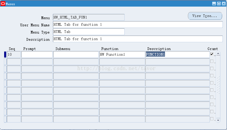 2. 为每个function分别建立一个HTML Tab 类型的菜单,并把相应的Function加入到菜单中,但不要声明Prompt,如下: