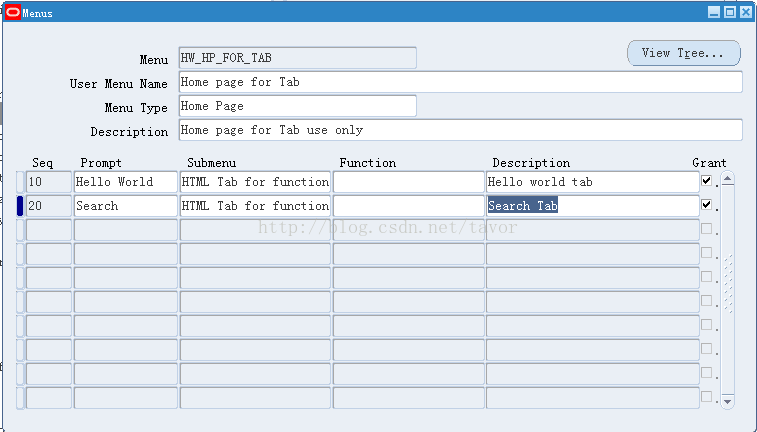 3. 建立一个Home Page类型的菜单,并把上面建立的两个HTML Tab菜单加入这个菜单中,并设置合适的Prompt,因为这里的Prompt会做为Tab的标题。