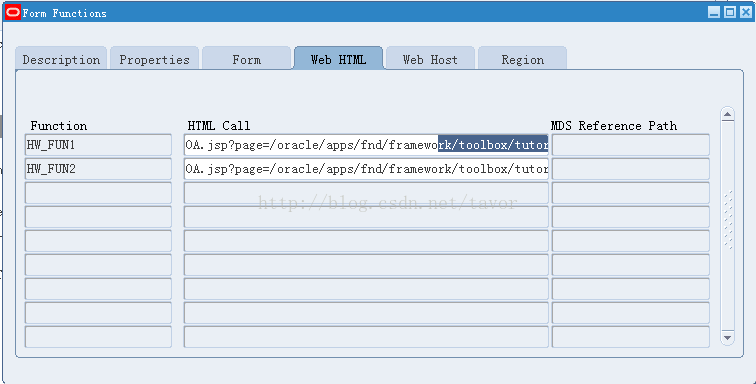 4. 建立好Home Page菜单之后,回去更改前面两个Function的HTML CALL来加入两个参数&OAHP=HW_HP_FOR_TAB&OASF=HW_FUN1,OAHP是Home Page菜单的名字,OASF是当前Function的名字,设置如下图,如果你的Home Page菜单是之前设计好的,那么在定义Function的时候就可以指定好这两个参数,不需要回来修改。