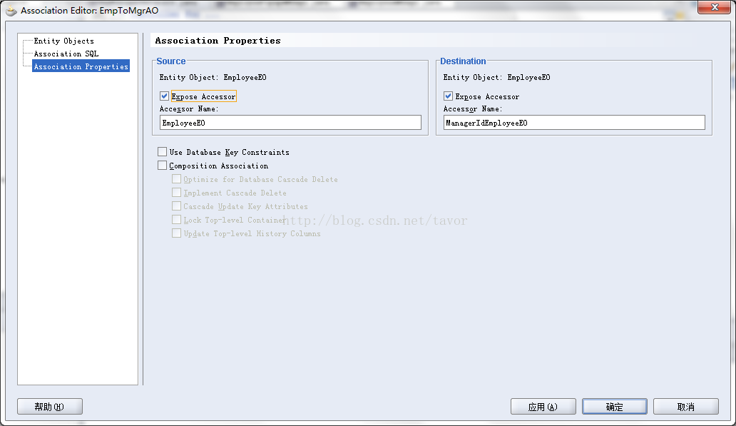1. AO的创建参考之前的文章和OAF Tutorial 示例代码,在AO设置可以在Employee EO访问Manager EO,这里的Accessor Name是ManagerIdEmployeeEO,如果不需要再Employee中访问其下属Eos的话,就去掉第一个复选框。