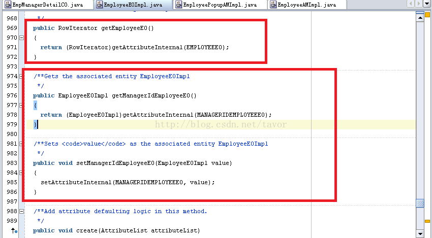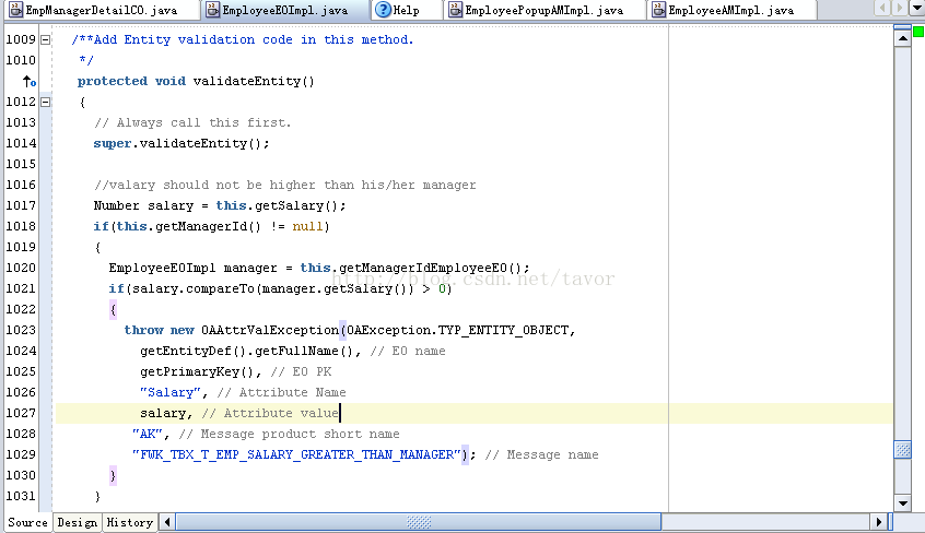 3. 在validateEntity()添加下面的代码进行验证,这里通过getManagerIdEmployeeEO()方法,会自动获取manager的EO,这里的message FWK_TBX_T_EMP_SALARY_GREATER_THAN_MANAGER是我自己加的。