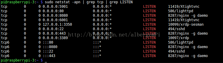 4、查看端口:sudo netstat -apn | grep tcp | grep LISTEN