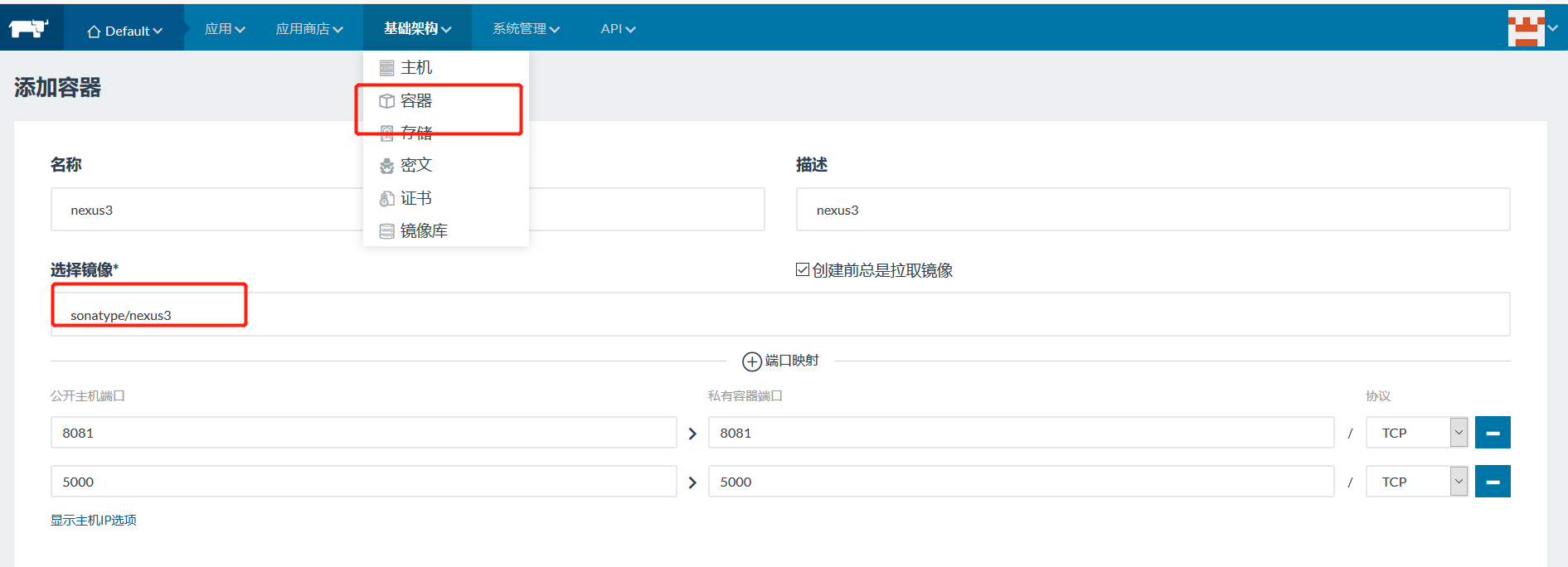 你可以通过页面对容器进行启动,停止,之类的操作,如果想从私有镜像仓库拉取一个仓库并启动的话可以这样做: