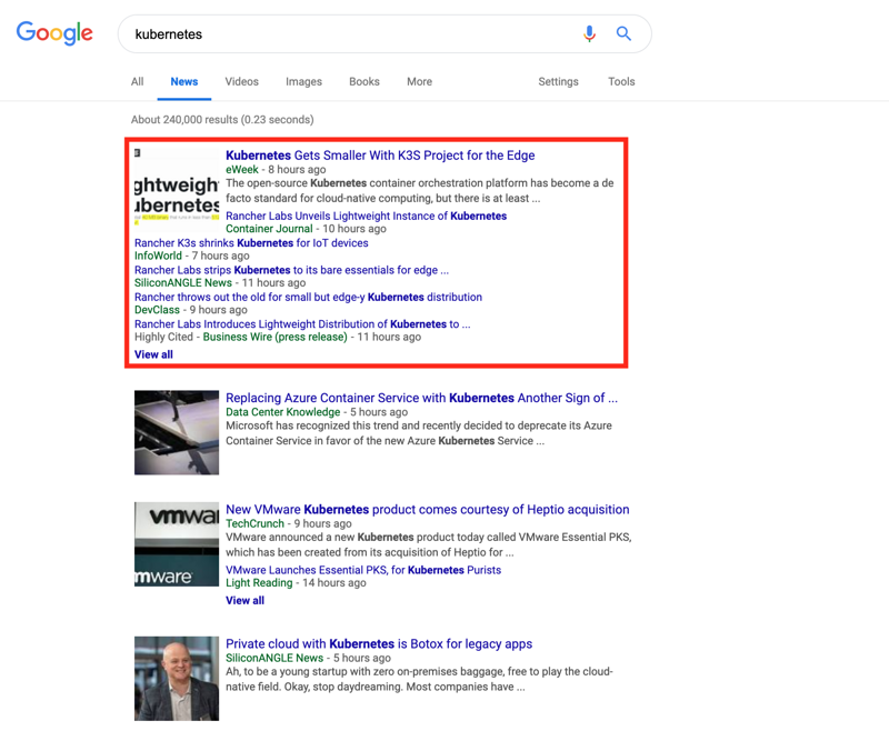 K3s发布当天,各种相关新闻直接登顶谷歌Kubernetes关键词搜索结果: