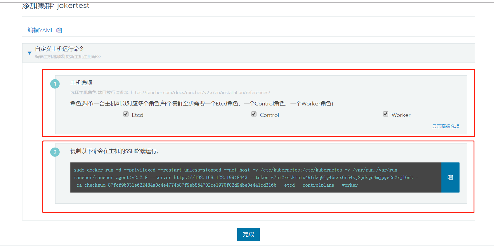 [root@localhost ~]# sudo docker run -d --privileged --restart=unless-stopped --net=host -v /etc/kubernetes:/etc/kubernetes -v /var/run:/var/run rancher/rancher-agent:v2.2.8 --server https://192.168.122.199:8443 --token z7nt2rskktntx49fdzq9lg46ssx6r54sj2jdsgd4mjpgc2c2rjl6nk --ca-checksum 87fcf9b031e622484a0c4e4774b87f9eb854702ce1970f02d94be0e441cd316b --etcd --controlplane --worker