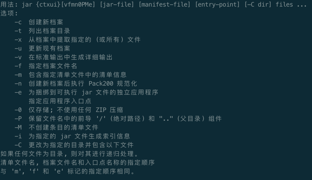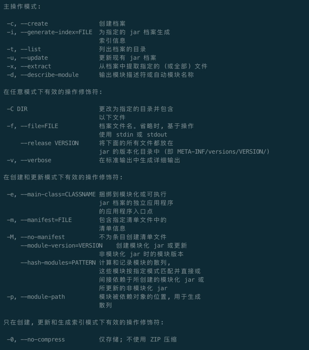 JDK也自带了一个jar命令,通过jar命令我们可以实现创建,更新jar包的操作,下图是JDK8中jar命令的说明: