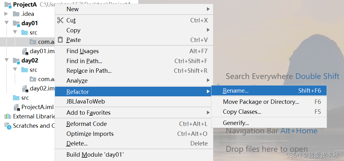 选中要重命名的包,右键-->Refactor-->Rename,快捷键Shift + F6