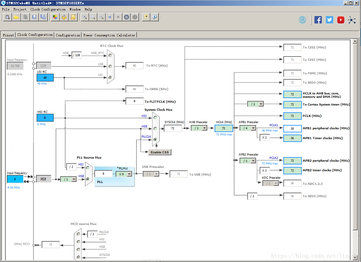 时钟配置采用图形配置,直观简单。各个外设时钟一目了然。STM32最高时钟为72M,此处只有在HCLK处输入72,软件即可自动配置。(RCC选择外部高速时钟)。