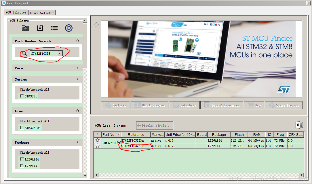 打开STM32cubeMX软件,点击New Project。选择对应开板MCU(STM32F103ZET6)。